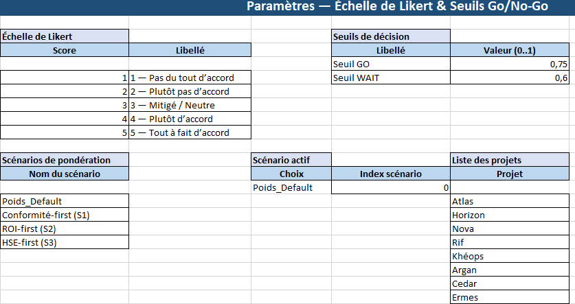 - Parametres_Likert : échelle Likert (libellés), seuils SEUIL_GO/SEUIL_WAIT, liste des projets, choix du scénario de poids (Default, Conformité-first, ROI-first, HSE-first).