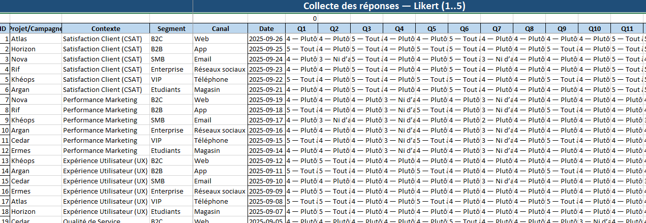 - Reponses / Reponses_Num : collecte multi-répondants (Projet/Campagne, Contexte, Segment, Canal, Date + Q1..Q12).