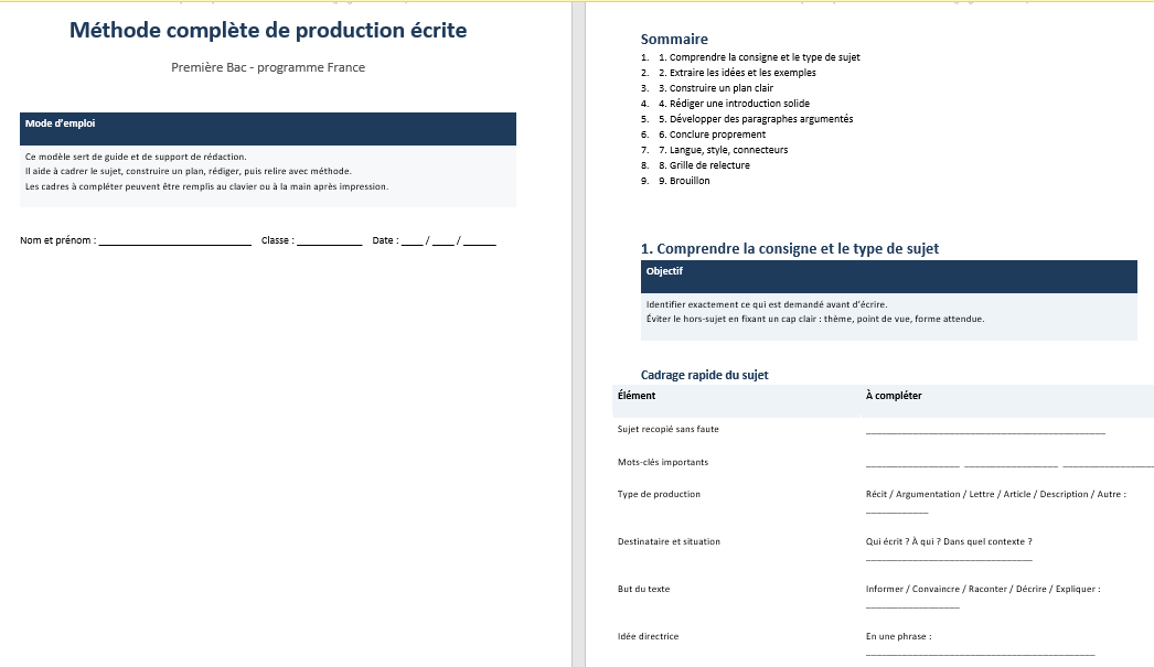 Ce guide propose une méthode complète, pensée comme un outil de référence. L’idée n’est pas de multiplier des astuces éparses, mais d’installer une procédure stable qui fonctionne sur les sujets les plus fréquents en Première : récit, article, lettre, texte argumentatif, description organisée.