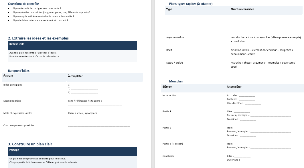 Vient ensuite la phase de préparation des idées. Le document propose des espaces volontairement limités. Ils obligent à sélectionner plutôt qu’à accumuler. On y inscrit les idées principales, puis un exemple concret pour chacune. À ce stade, il n’est pas question de rédiger de longues phrases : il s’agit de préparer une matière claire, exploitable, qui se transformera facilement en paragraphes. Ce passage évite le blocage devant la page blanche et réduit les répétitions pendant l’écriture.