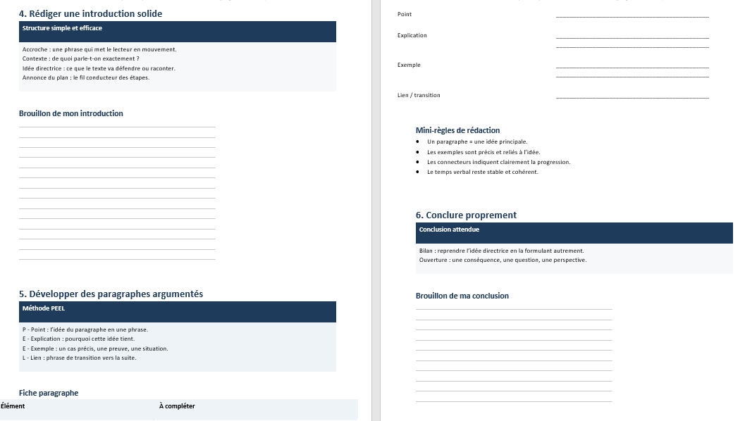 La partie rédaction constitue le cœur du document. Les gabarits proposés n’écrivent pas à la place de l’élève. Ils rappellent simplement la logique d’un bon paragraphe : une idée claire, une explication, un exemple, puis une phrase qui referme. En suivant ces repères, l’écriture gagne en fluidité et en cohérence, sans devenir mécanique.