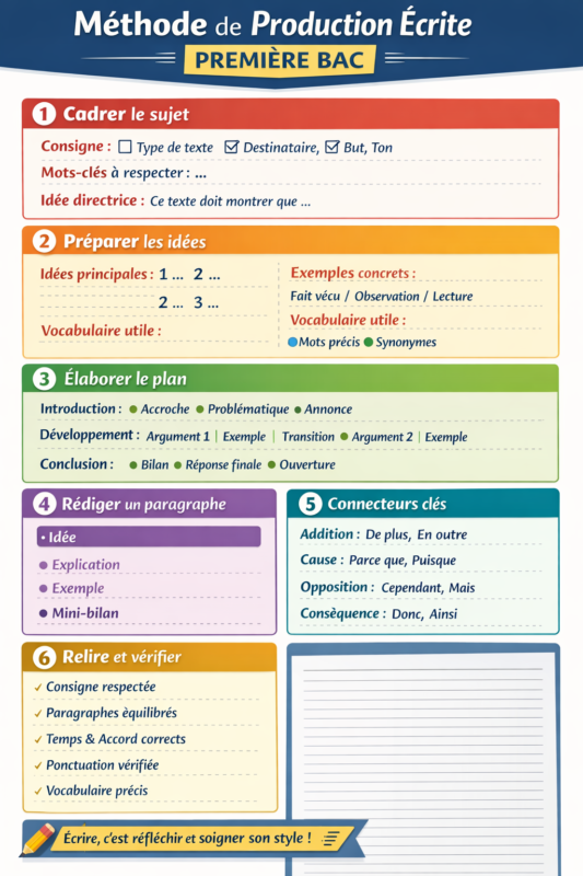 Méthode complète de production écrite en Première Bac : fiche Word d’aide à la rédaction