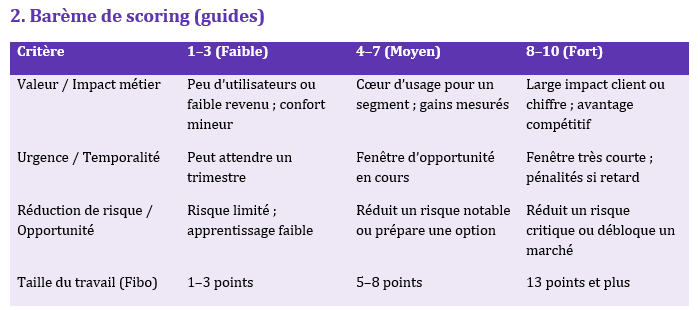 | Élément | Valeur | Urgence | Risque/Opport. | CoD | Taille | WSJF |