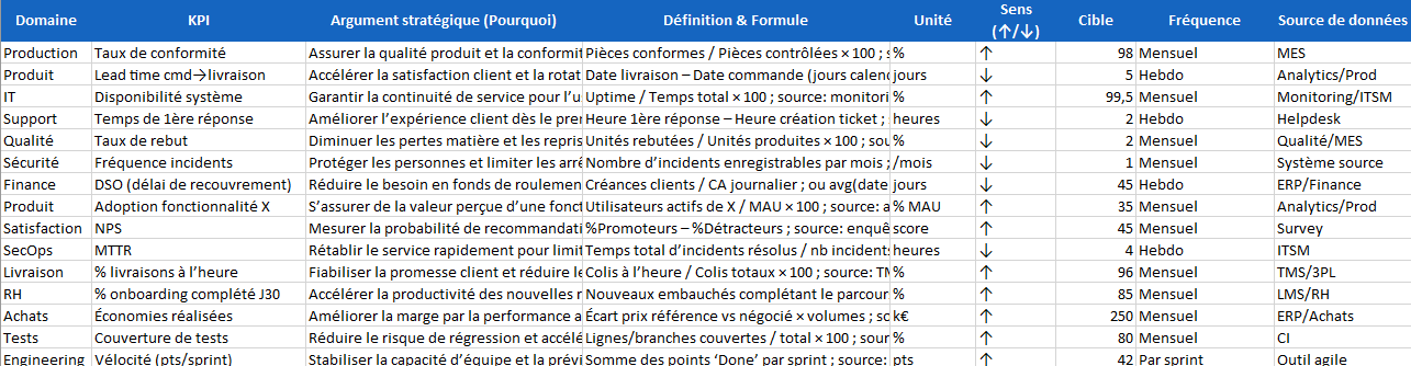 - Valeur / Impact métier : revenus, satisfaction, conformité, objectifs stratégiques…
