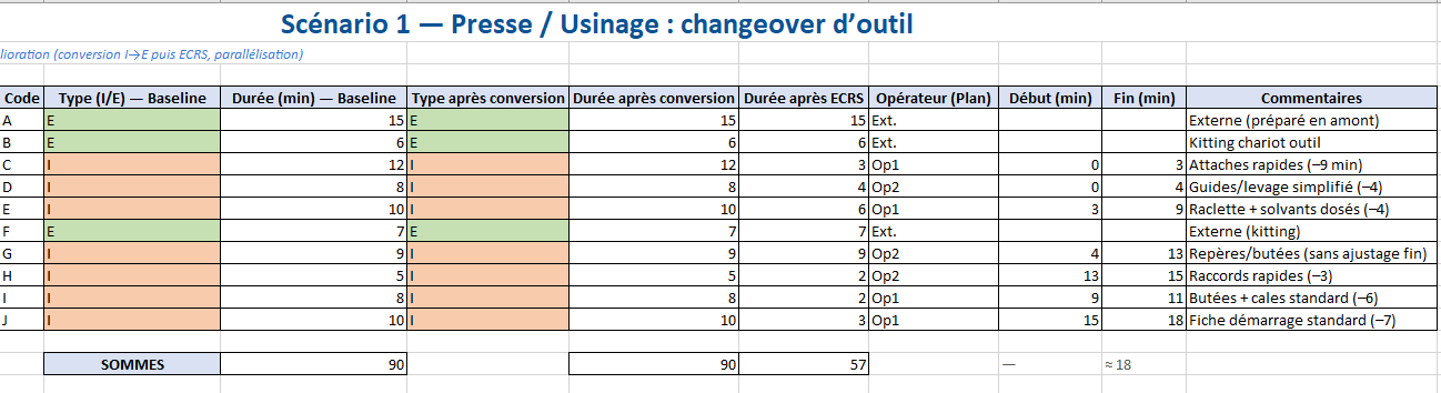 - Périmètre : 1 machine (ou processus logistique) à fort temps de changement.