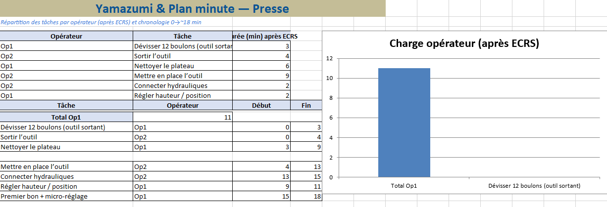 - Durée après ECRS : appliquez Éliminer / Combiner / Réordonner / Simplifier (attaches rapides, repères, butées…).