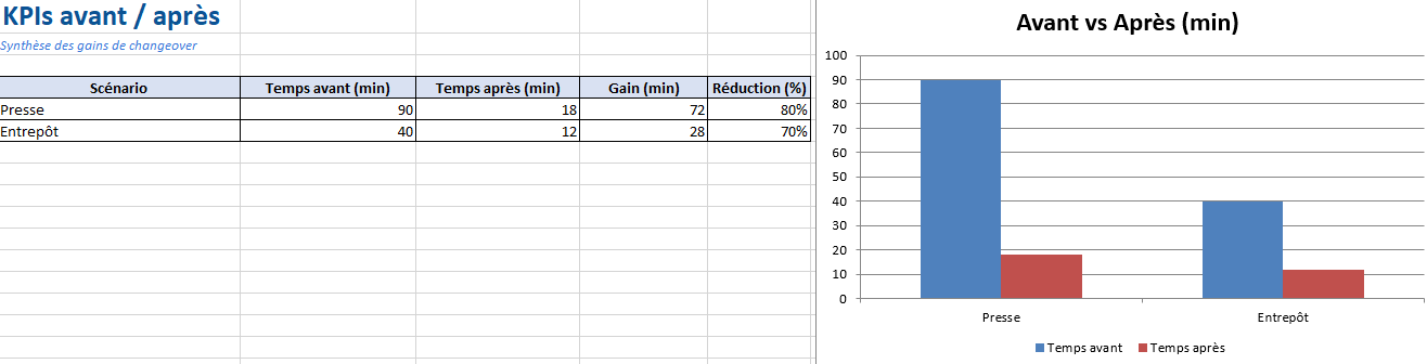 - Temps avant / Temps après → calcule Gain (min) et Réduction (%).