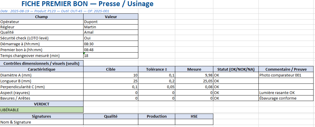 - Critère “premier bon” défini (tolérances, contrôle libératoire).