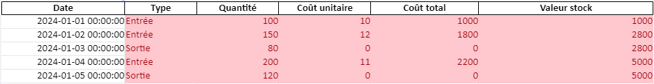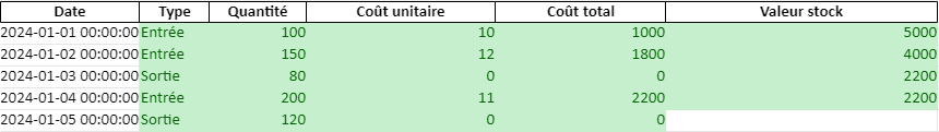 - Étape 1 : Créer une liste des articles entrants avec leurs coûts unitaires et les dates d’entrée.