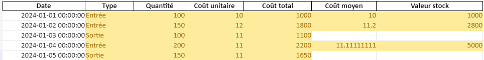 - Étape 2 : Calculer le coût moyen pondéré à chaque fois qu’il y a une entrée ou sortie.