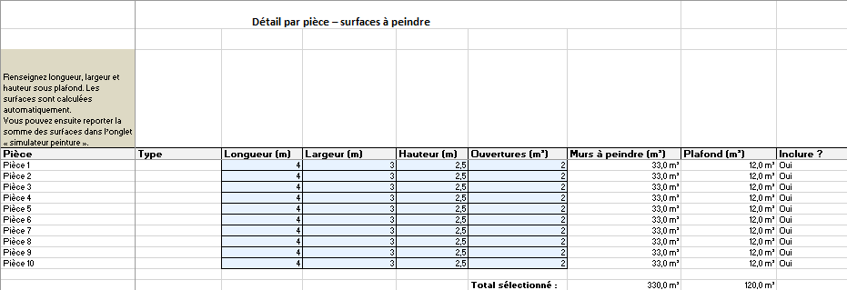 À partir de là, les surfaces de murs et de plafond sont calculées automatiquement. On peut choisir quelles pièces inclure ou non. En bas du tableau, les totaux s’affichent.