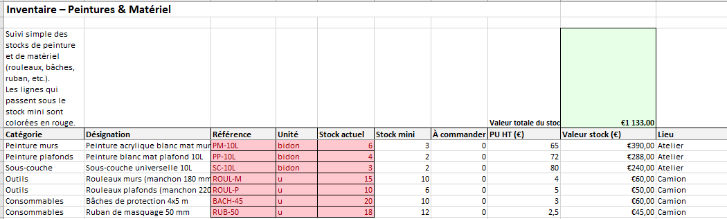 Les lignes qui passent sous le stock mini se mettent en rouge : pas besoin d’être expert Excel, tu vois directement où ça clignote.