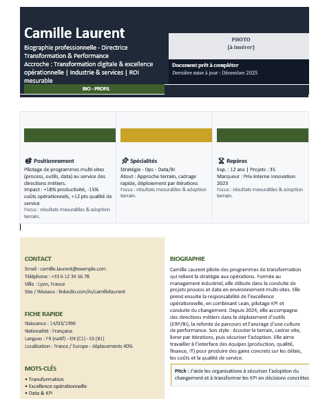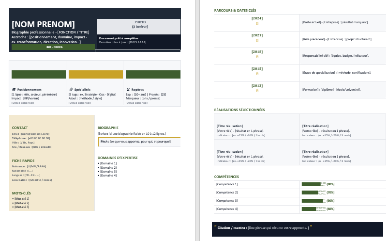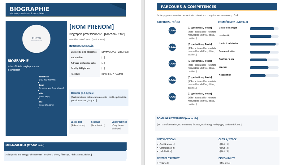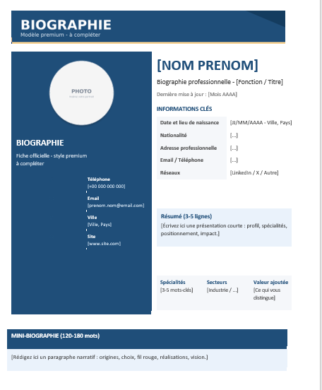 Une biographie agit comme une carte de visite longue durée. Elle raconte un parcours, installe une crédibilité, met en valeur des compétences et donne envie d’en savoir plus. Le fond compte, évidemment, mais la forme joue un rôle décisif : une bio dense et mal structurée fatigue vite, alors qu’un document aéré, hiérarchisé, “designé” comme une fiche premium se lit naturellement, même en diagonale.