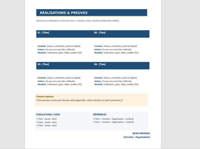 - Réalisations : projets, résultats, livrables (avec preuves concrètes)