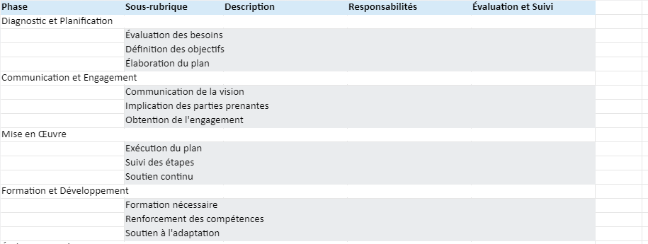 - Évaluer continuellement les progrès et ajuster les stratégies en conséquence pour garantir le succès du changement.