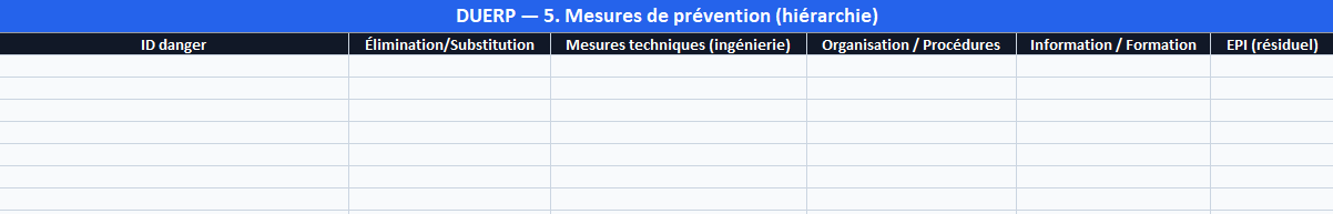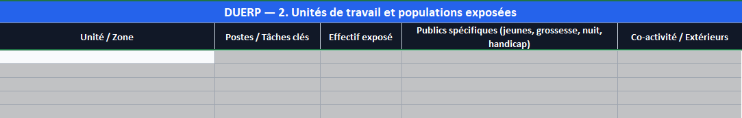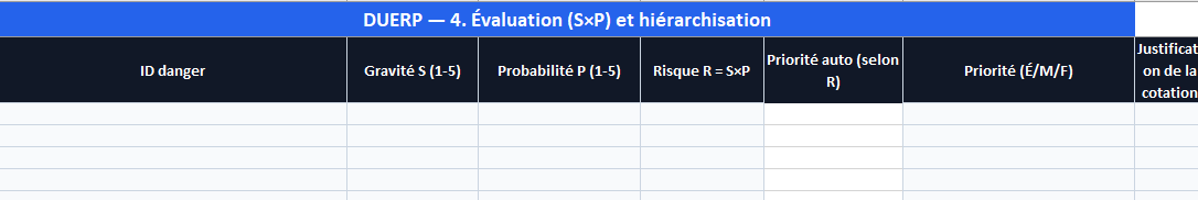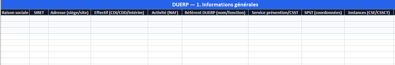 Un modèle Excel pour le DUERP devrait généralement comprendre les sections suivantes :
