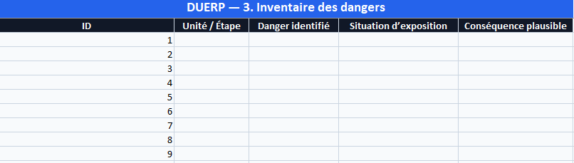 Liste structurée (ID, unité/étape, danger, situation d’exposition, conséquence).