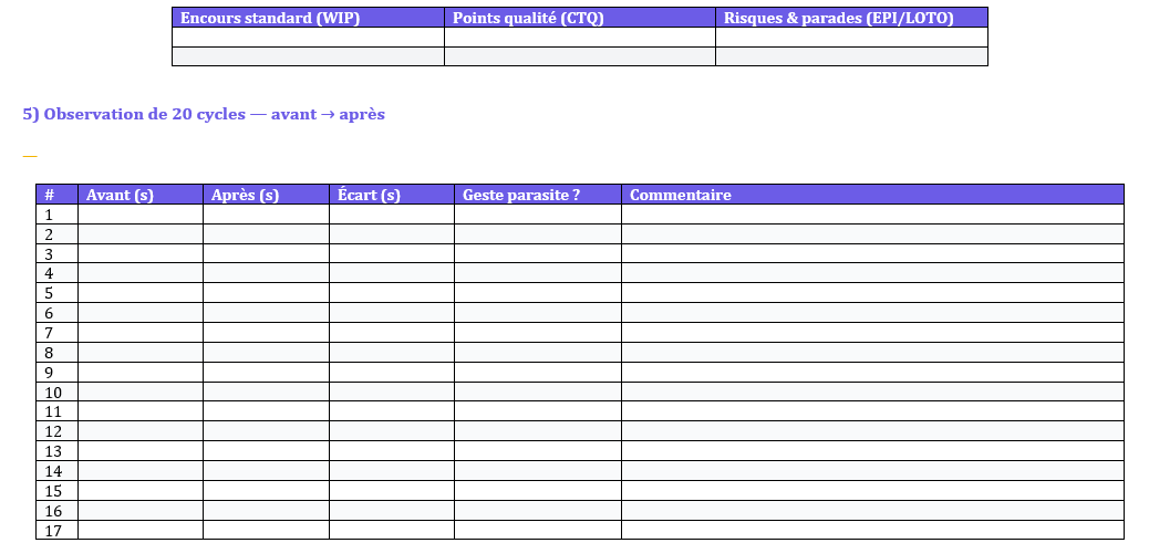 - On commence par voir : poste, code du standard, takt, temps avant/après. La feuille plante le décor et évite les débats d’opinion.
