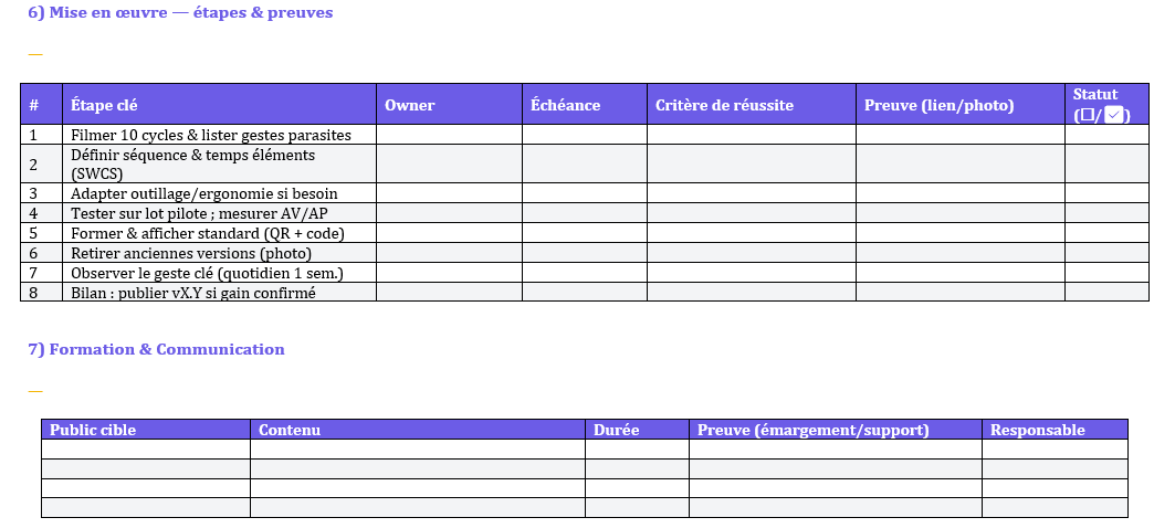 - Contexte & Objectif : problème factuel ↔ critère observable (ex. “0 geste parasite”, “cycle ≤ takt”).