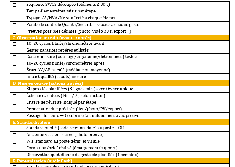 Ci-après la liste des checks prêts à utiliser pour votre Standard Work (du cadrage jusqu’à la pérennisation). Vous pouvez les copier tels quels dans votre feuille.
