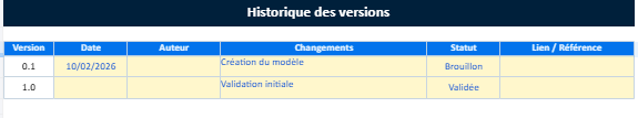 L’onglet Historique sert de mémoire. À chaque modification importante, ajoutez une ligne avec la date et le changement effectué. Cela évite les confusions entre anciennes et nouvelles versions.