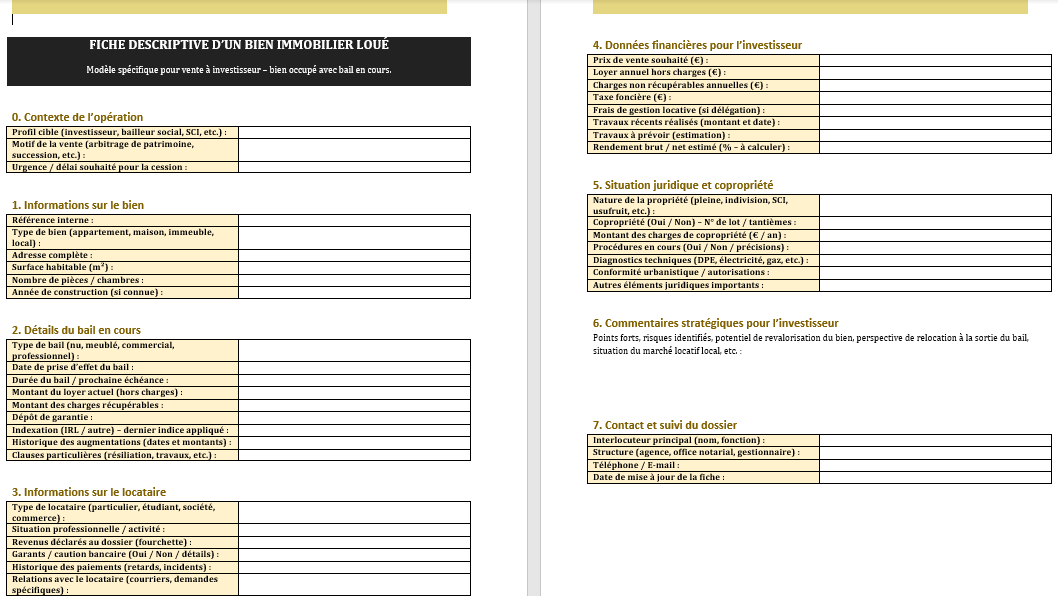 Une vente immobilière change immédiatement de dimension lorsqu’il s’agit d’un bien déjà loué. Le prix de vente, la négociation, le profil de l’acquéreur, les documents à présenter : tout est filtré par une idée centrale, le rendement locatif. La fiche descriptive “classique” ne suffit plus ; il faut un support pensé pour l’investisseur, qui rassemble en une seule page les informations clés sur le bien, le bail, le locataire et les flux financiers. C’est précisément le rôle d’une fiche descriptive d’un bien loué avec bail en cours.
