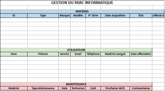 Ce modèle a pour but de centraliser toutes les informations clés du parc informatique d’une entreprise dans un seul fichier, organisé de façon visuelle et logique. Il permet de suivre les équipements, gérer les affectations aux utilisateurs, et documenter les maintenances préventives ou correctives.