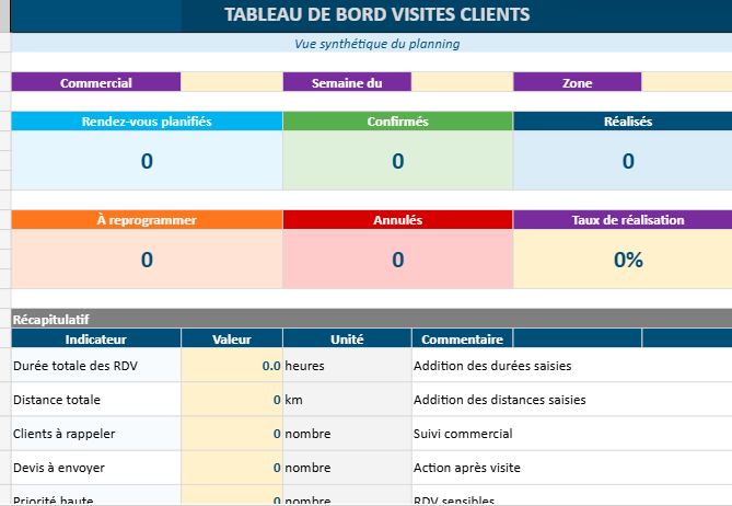 Un modèle prêt à l’emploi fait gagner du temps, donne une base claire dès le départ et évite de construire le fichier de zéro. Il permet de passer plus vite à l’essentiel : organiser ses visites, suivre ses actions et mieux gérer la relation client.