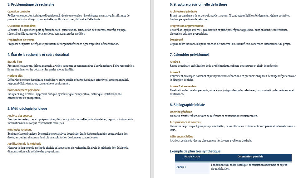Même si les universités et les écoles doctorales peuvent avoir leurs propres attentes, certaines parties sont devenues presque incontournables dans la présentation d’un projet juridique sérieux.