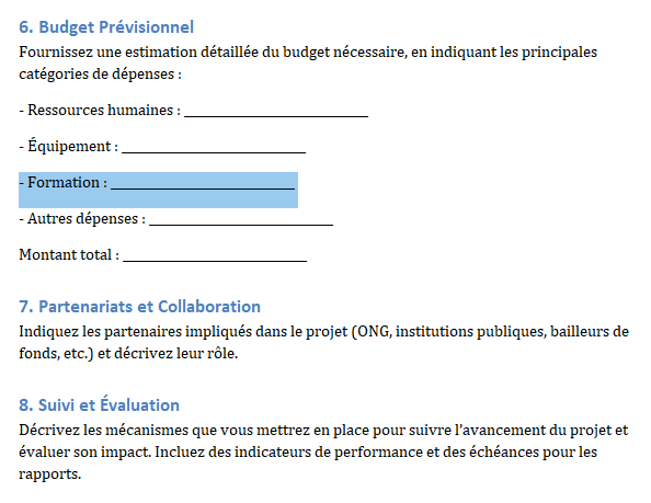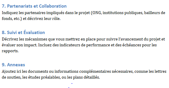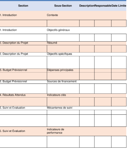 Ce plan détaillé peut être personnalisé selon les exigences spécifiques du projet ou du bailleur de fonds. Il garantit que toutes les informations nécessaires sont bien organisées et présentées de manière professionnelle.