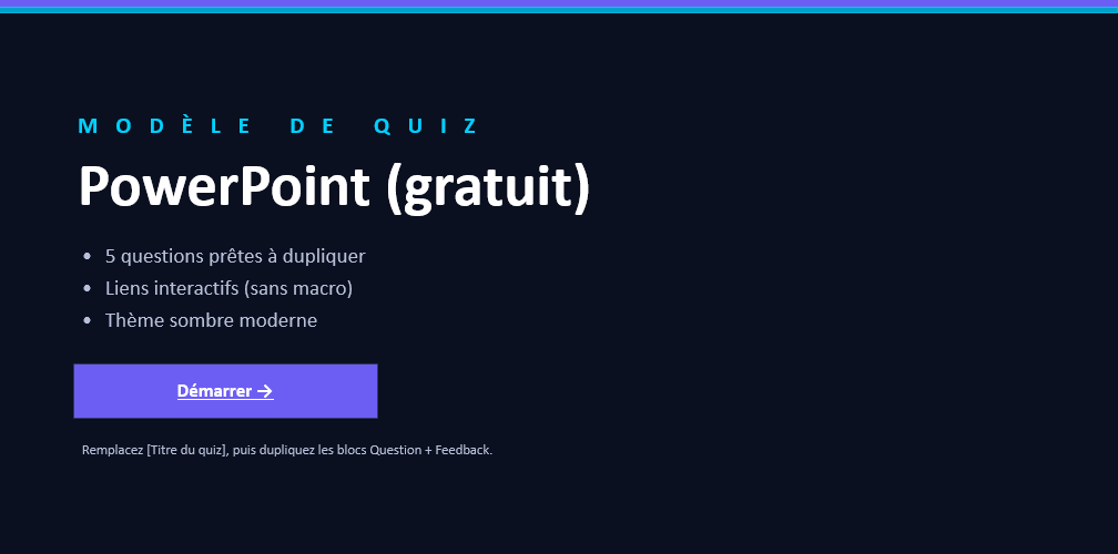 Un quiz PowerPoint peut faire bien plus que “poser des questions”. Quand il est bien construit, il devient un petit parcours interactif : on clique, on choisit, on reçoit un feedback immédiat, on progresse question après question. Le tout sans plateforme externe, sans compte, sans connexion, et surtout avec un format que tout le monde connaît déjà. C’est précisément l’intérêt d’un modèle de quiz PowerPoint gratuit : gagner du temps, structurer l’animation, et offrir un rendu propre, prêt à l’emploi.