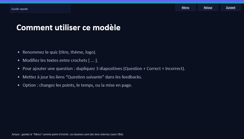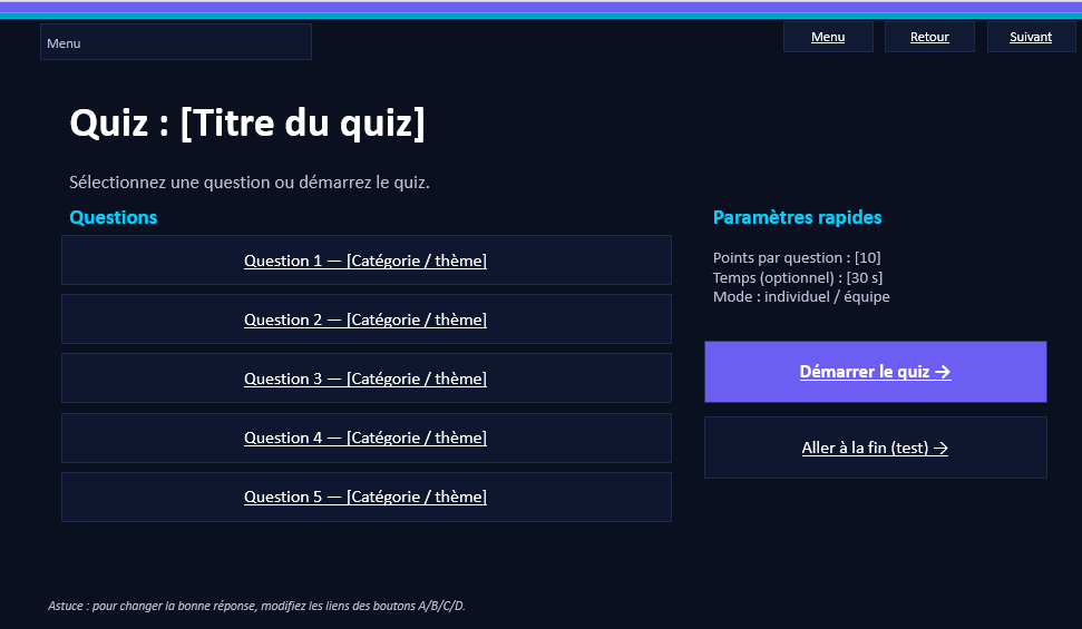 Bienvenue ! Ce quiz a été pensé pour être simple à animer et agréable à jouer : tu cliques, tu obtiens une réponse immédiate, puis tu avances au rythme du groupe. Aucun outil externe, aucune macro : tout se fait avec des boutons interactifs dans PowerPoint.