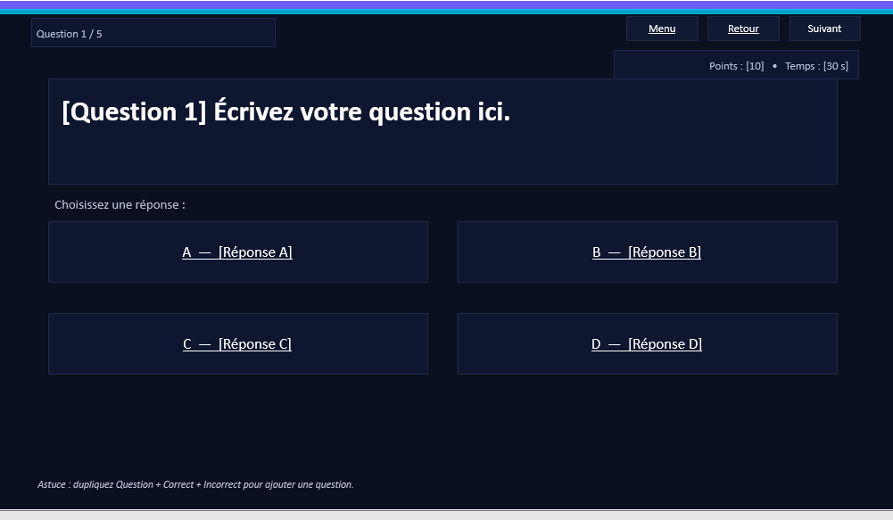 Tu peux adapter ce quiz à ton thème en quelques minutes.