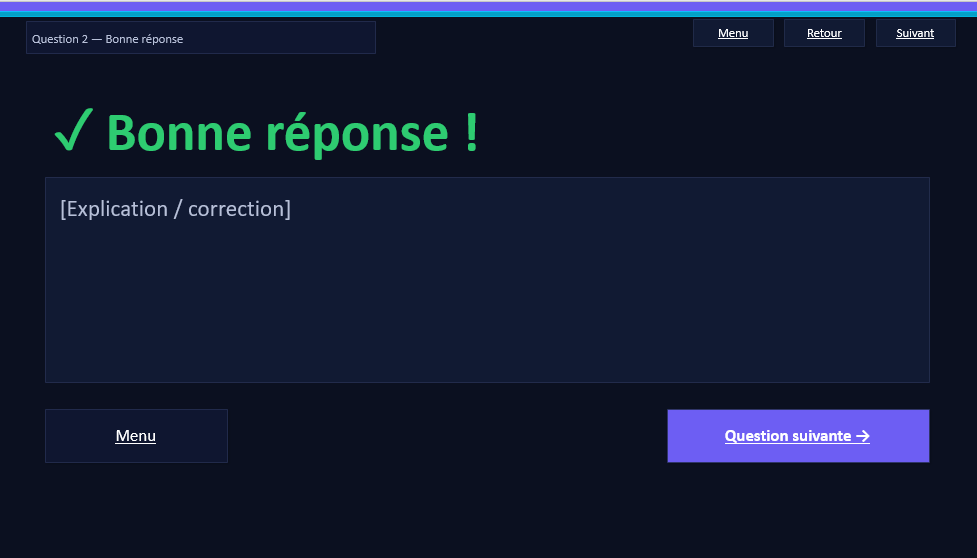 • Sur “Bonne/Mauvaise réponse” → bouton Continuer vers Question suivante