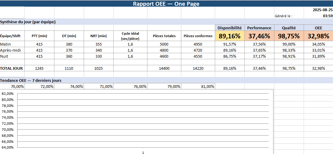 • Un OEE global qui masque les lignes faibles : faites tourner la même one page par ligne/référence critique.
