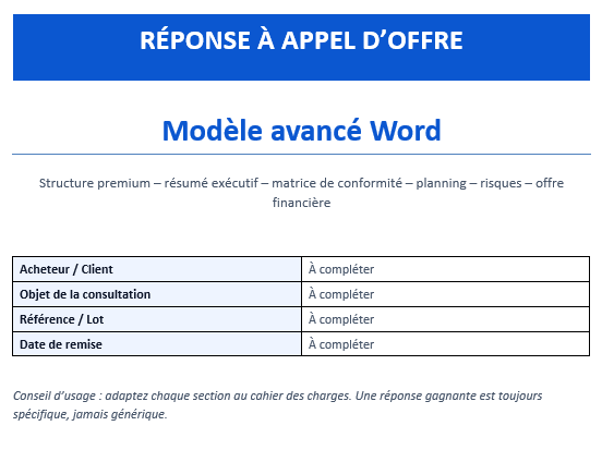 Modèle Word Premium pour Réponse à un Appel d’Offre – Structure complète, tableaux et mise en page professionnelle