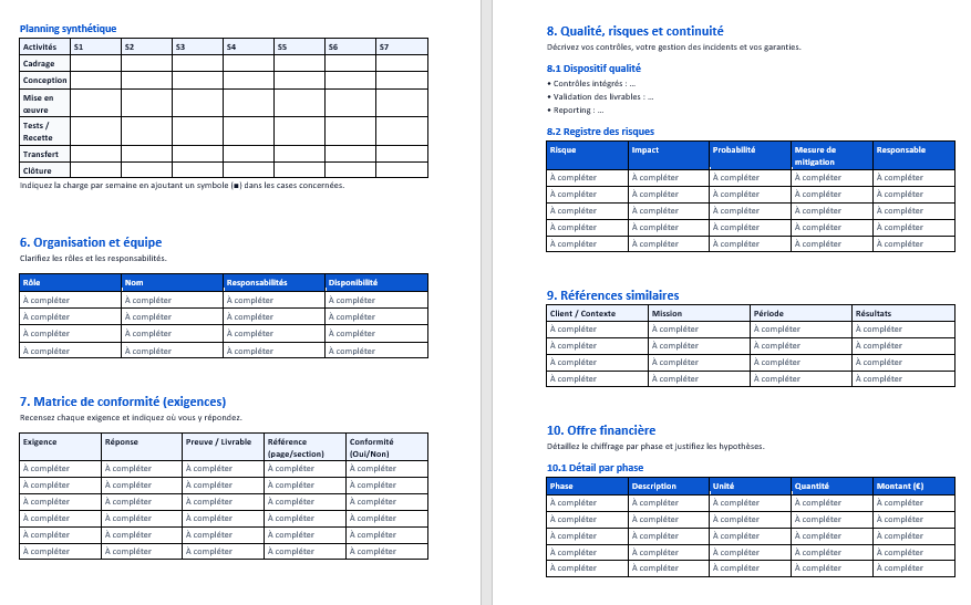 Le document vous guide ensuite vers une présentation fluide de votre méthodologie, organisée en étapes concrètes et faciles à lire. Les tableaux intégrés vous aident à exposer clairement votre planning et votre proposition financière, sans surcharge ni confusion. Chaque section suit une logique professionnelle pensée pour faciliter la lecture de l’évaluateur et rendre votre réponse plus convaincante sans alourdir le contenu.
