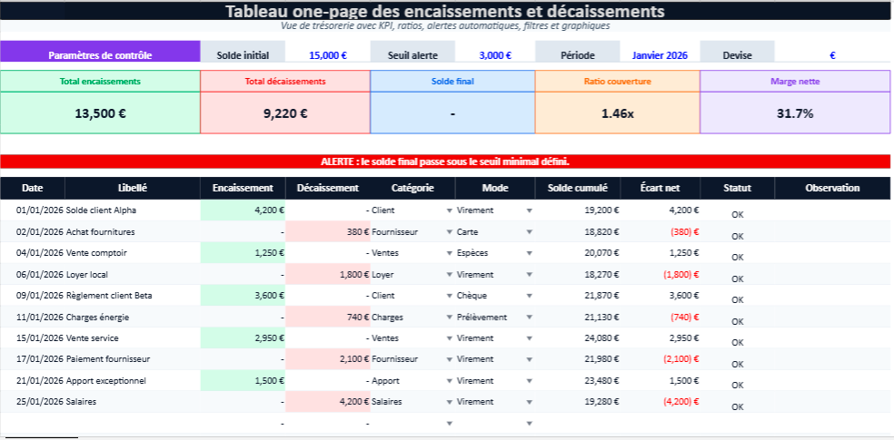 Ce tableau permet de suivre la trésorerie de manière simple : visualiser ce qui entre, ce qui sort, et ce qu’il reste.