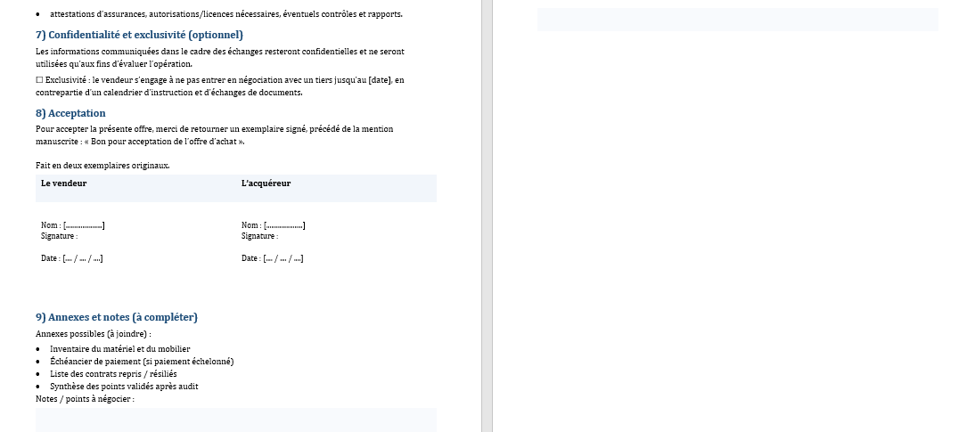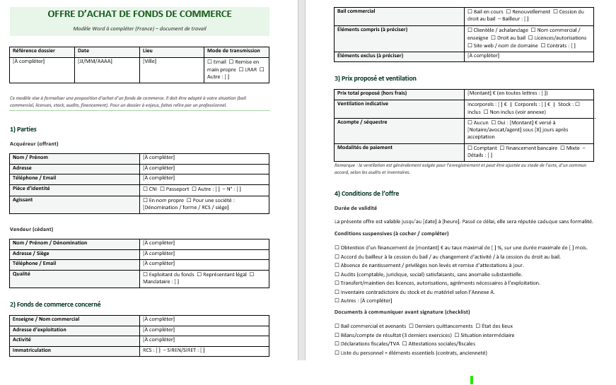 Télécharger un modèle Word d’offre d’achat de fonds de commerce ⬇️