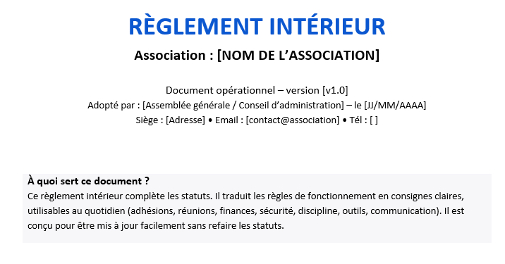 Voici un exemple de règlement intérieur standard que vous pouvez adapter à votre association :