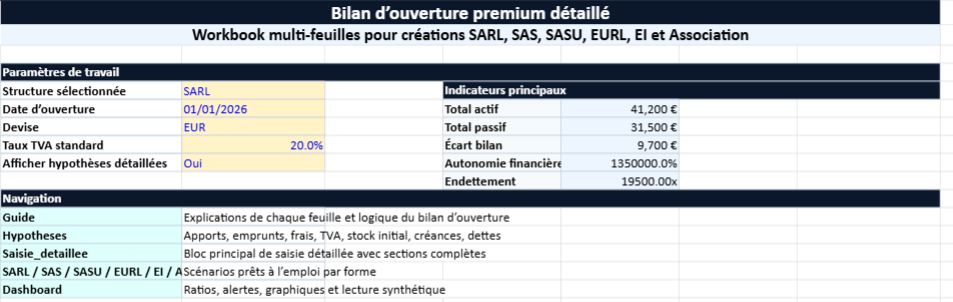 Modèle Excel Bilan d’ouverture premium détaillé multi-feuilles