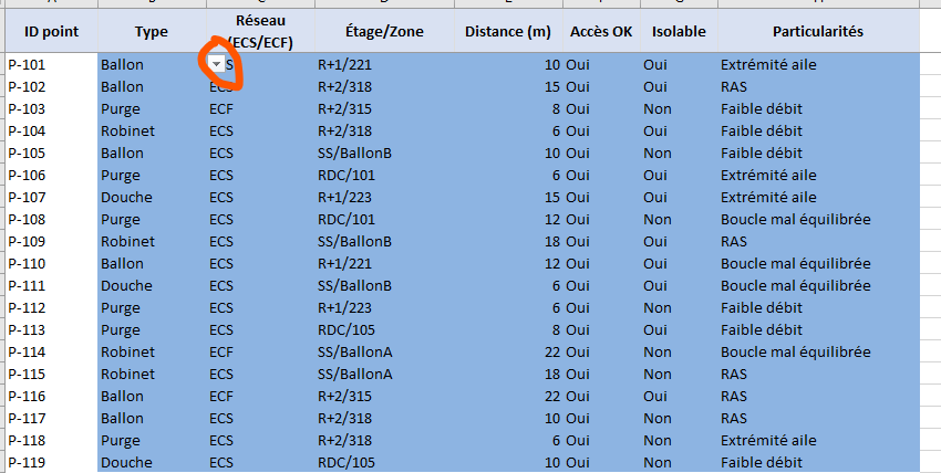 - Colonnes : ID point, Type (Robinet/Douche/Ballon/Purge), Réseau (ECS/ECF), Zone/Étage, Distance (m), Accès, Isolable, Particularités.