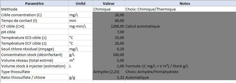 C3: Concentration cible C (mg/L)C4: Temps de contact t (min)C6: pH cibleC7: Température ECS ≥ (°C)C8: Température ECF ≤ (°C)C9: Seuil chlore résiduel (mg/L)C10: Concentration du stock (g/L)C11: Volume réseau (m³)C13: Type thiosulfate (Anhydre (2,23) ou Pentahydrate (3,5))