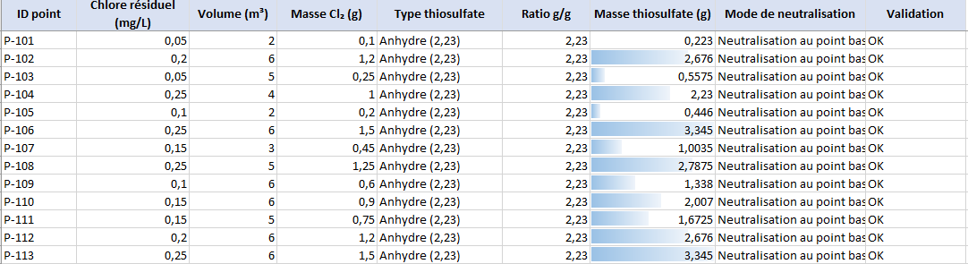 - A : ID point | B : Chlore résiduel (mg/L) | C : Volume (m³) | E : Type thiosulfate | H/I : mode & validation