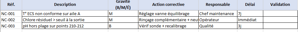 - Colonnes : Réf., Description, Gravité (B/M/É), Action corrective, Responsable, Délai, Validation.