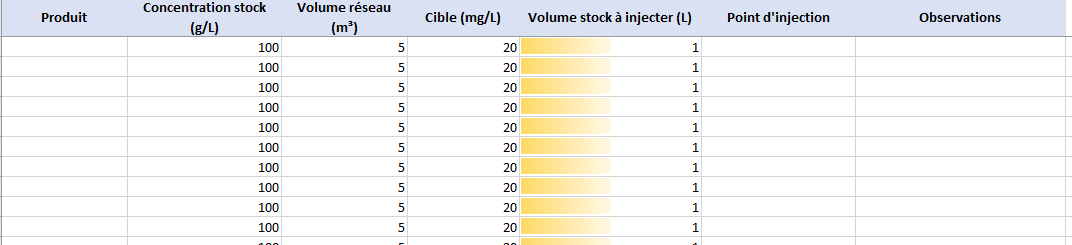 - Tu saisis : Produit, éventuellement Volume m³ différent, C cible si spécifique, point d’injection, observations.