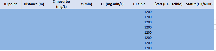 C5 = C3 × C4→ CT cible (mg·min/L)C12 = (C3 × C11) / C10→ Volume de stock à injecter (L)C14→ Ratio thiosulfate (2,23 ou 3,5 g/g selon le type)