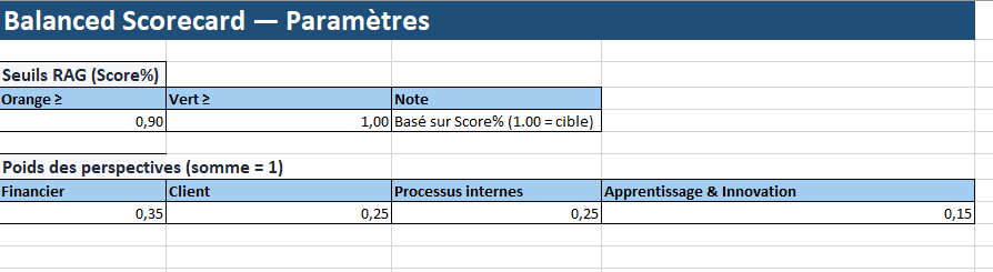 • Colonne Poids : importance stratégique de chaque perspective (pilotée par Paramètres).