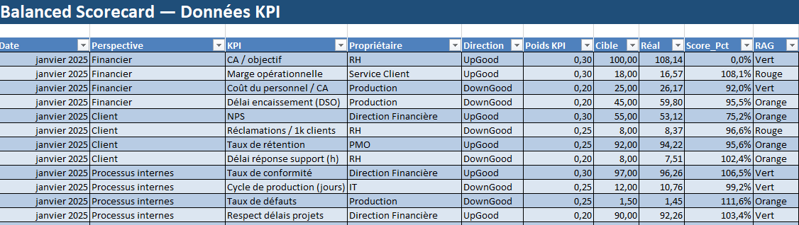 • Date (premier jour du mois), Perspective, KPI, Propriétaire (équipe/acteur), Direction (UpGood si “plus = mieux”, DownGood si “moins = mieux”), Poids KPI, Cible, Réal, puis deux colonnes calculées :
