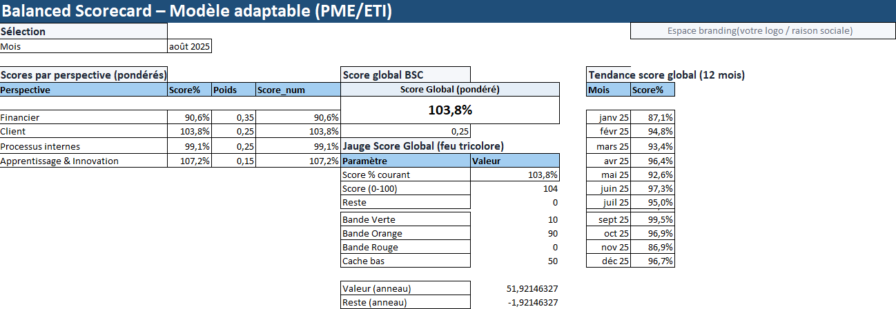 • Colonne Score % : performance du mois pour la perspective, calculée à partir des KPI et de leurs poids (dans Data_KPIs).